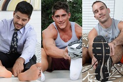 It’s a hot daddy-son style: macho silver daddy vs. hot muscle jock. It turns me on watching Smith explore Miller’s sexy body, play with his sensitive nipples while kissing Miller gently on his neck.